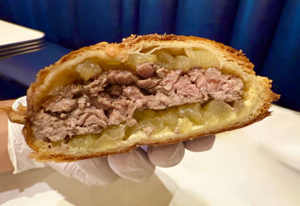 サクサクのパイ生地に包まれた甘酸っぱいリンゴとコク深いカスタード。その組み合わせに、肉厚ジューシーな特製パティと、とろ~りモッツァレラチーズを大胆にイン!
