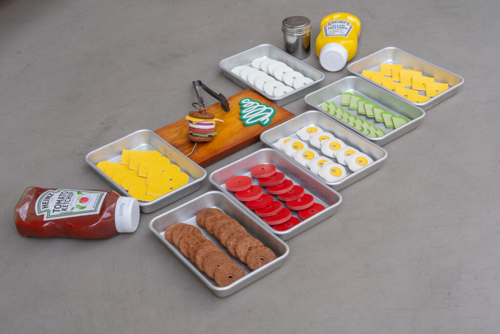 パティ(肉):「肉を食べている」という実感を裏付ける、肩ロースの力強い質感。 噛み締めるたびに溢れるパティの重厚な存在感を、表面に豊かな起伏(シボ)を持つ革で表現しました。