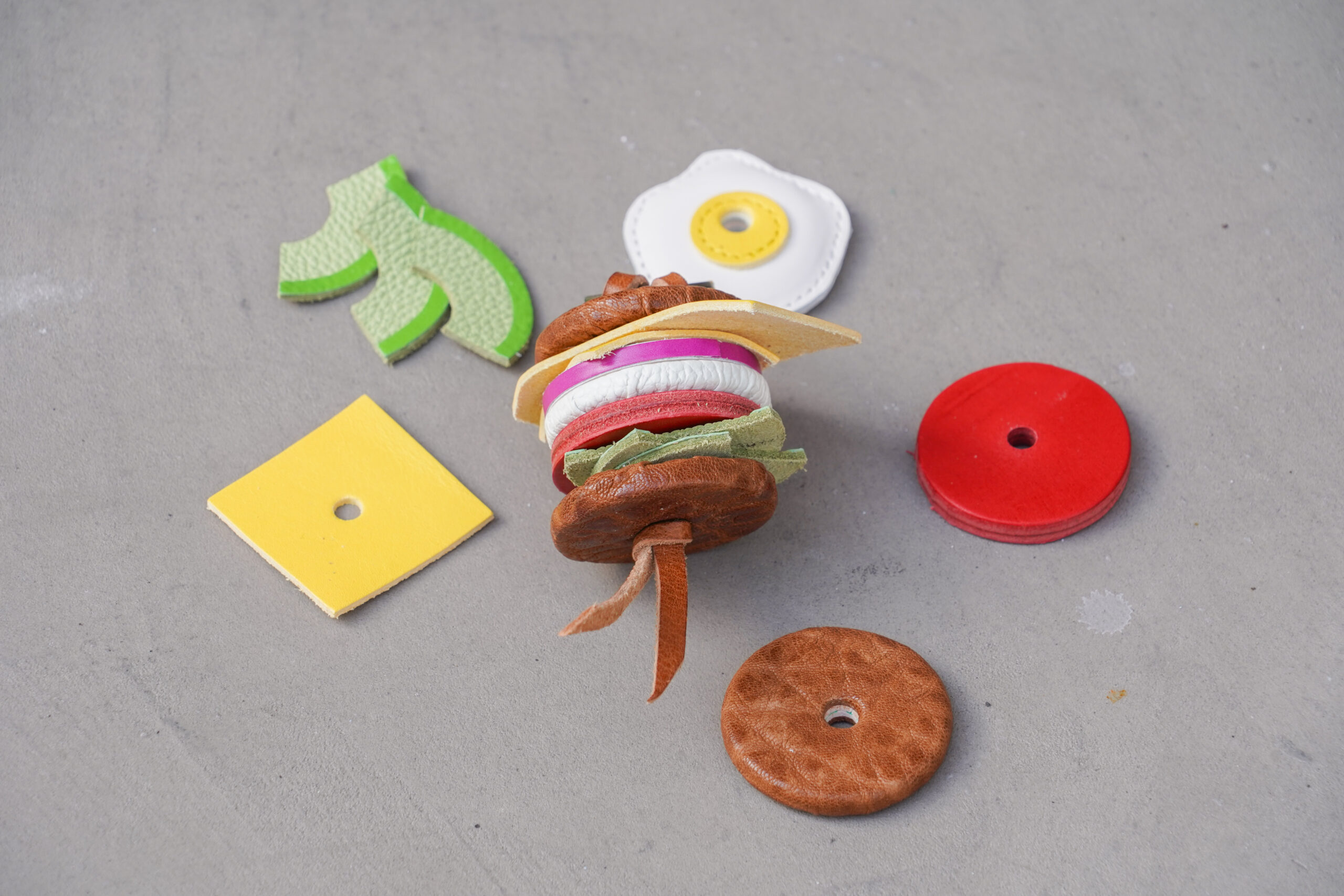 長年、最前線で「本物の革」に触れ続けてきた職人の目があるからこそ、このプロジェクトは始まりました。 数あるストックの中から、実際の食材が持つ質感や色の個性を表現するために、一パーツずつ、表情の異なる革を厳選しています。