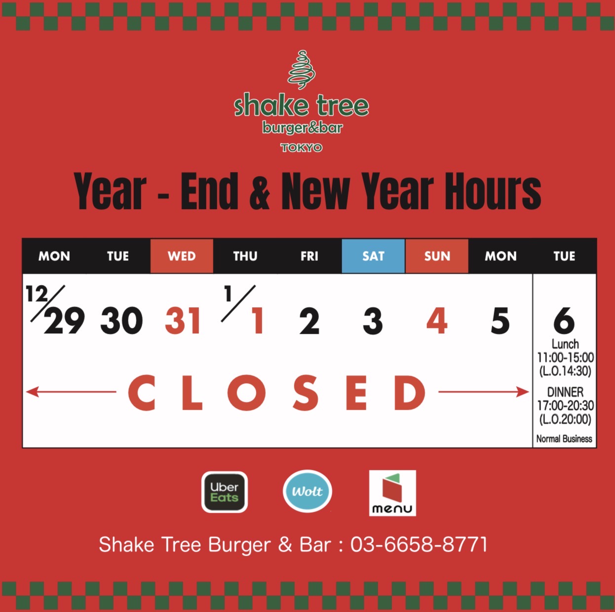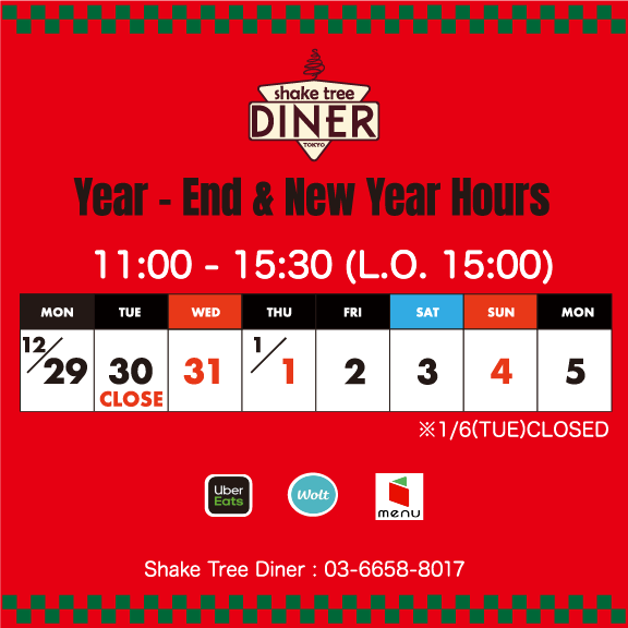 From December 29, 2025 (Mon.) to January 5, 2026 (Mon.), Shake Tree Diner will be open from 11:00 to 15:30 (L.O. 15:00) with limited menus.